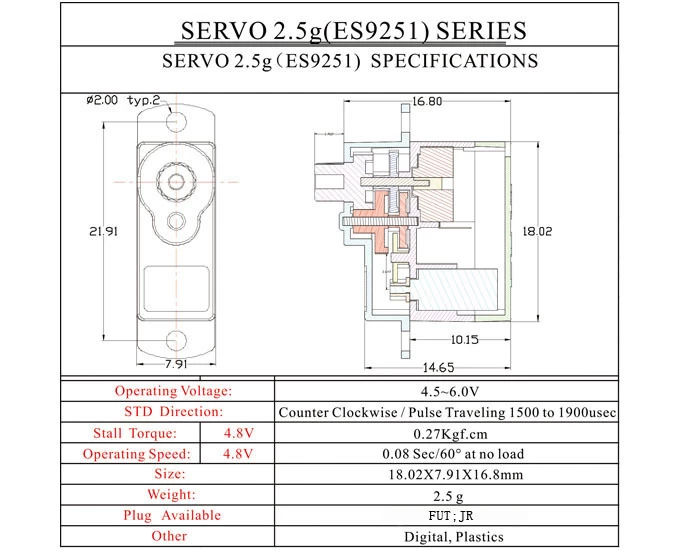 - Operating Speed:4.8V 0.08 Sec/60° (with no load)