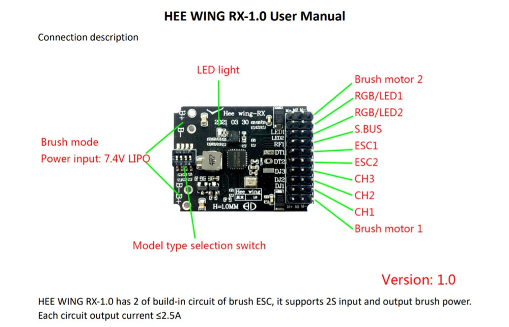 - Flying wing mode 1, dual servos mixing mode, suit for HEE WING F-01 wing type(Servo will
