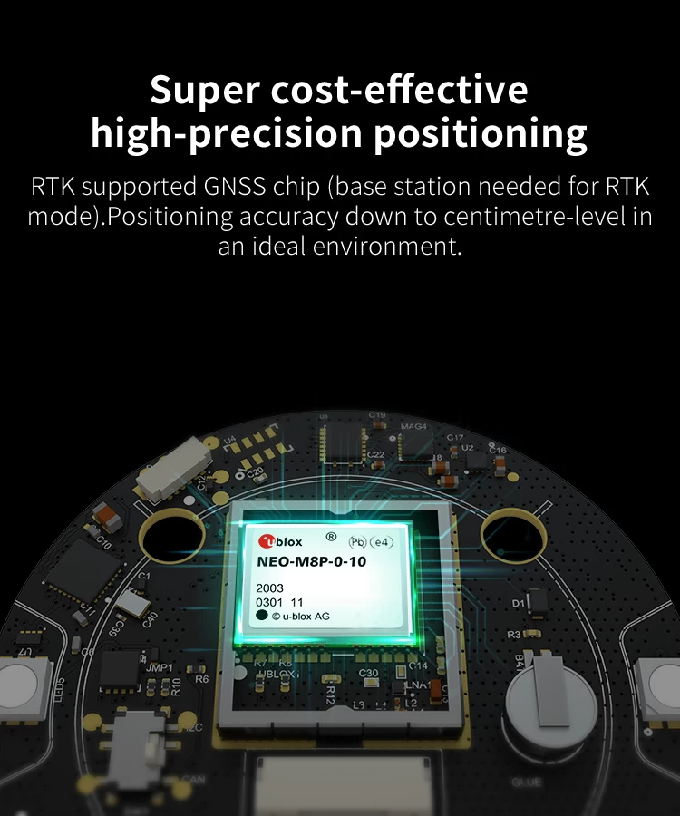 - Cost efficient high precision and RTK supported GNSS chip (base station needed for RTK).Positioning accuracy down to centimetre-level in ideal environment.