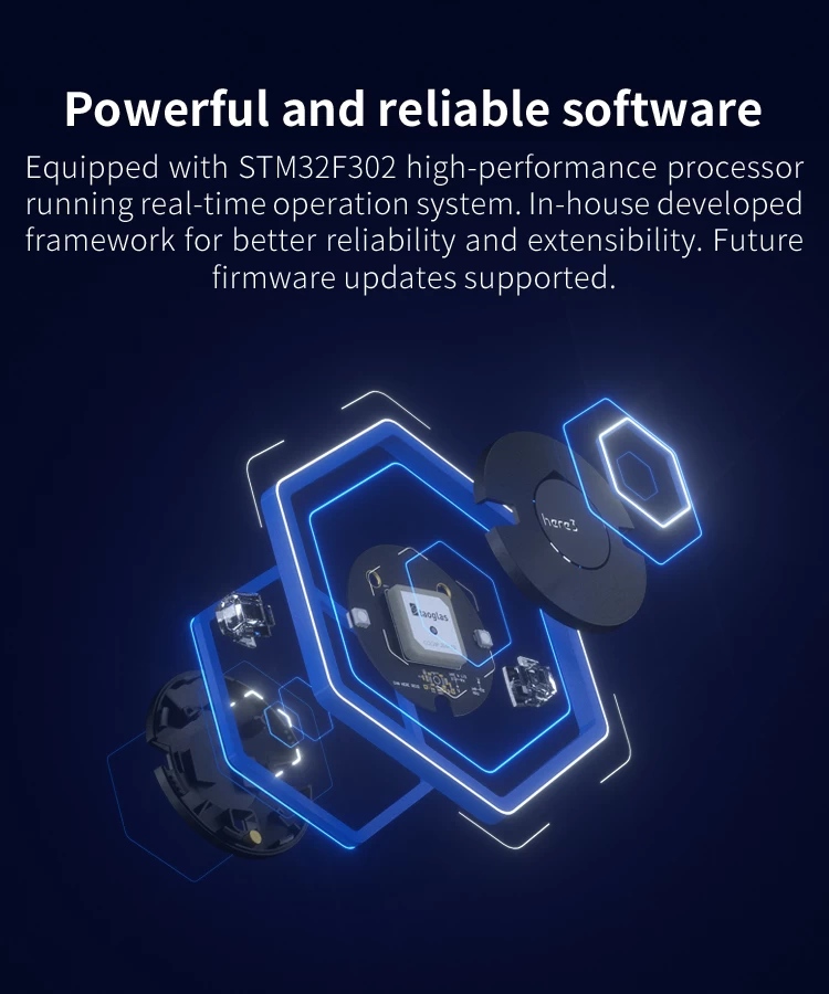 - Equipped with STM32F302 high-performance processor in real-time operation system. Framework developed by Hex provides additional stabilities. Supports future firmware updates.
