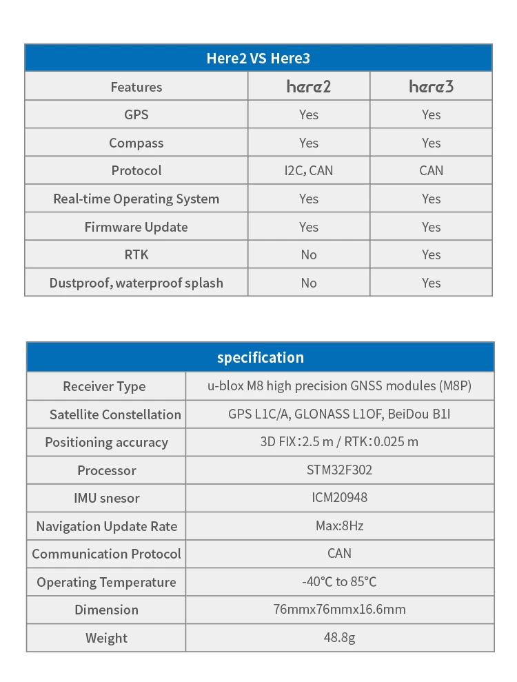 The Here3 GPS is a high precision GNSS system, which also supports RTK navigation mode, built with CAN protocol. It is also designed to be dust-proof and splash proof. Equipped with STM32F302 processor, the Here3 provides faster processing speed and better reliability. The Here3 has built-in sensors such as compass, gyroscope, accelerometer, and status LED. It runs on a Chibios real-time operation system. Its open source structure is ideally suited to developers who need specialized requirements on their navigation system.