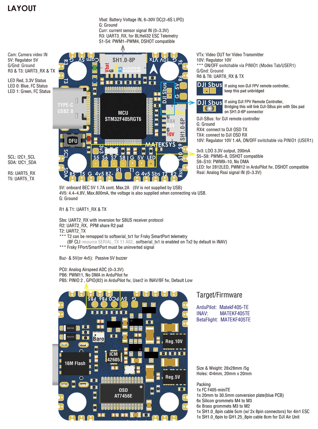 - Compared with F722-miniSE 8motors or 6motor+2servos, F405-miniTE support 8motors+3servos in INAV/BF multirotor mixer