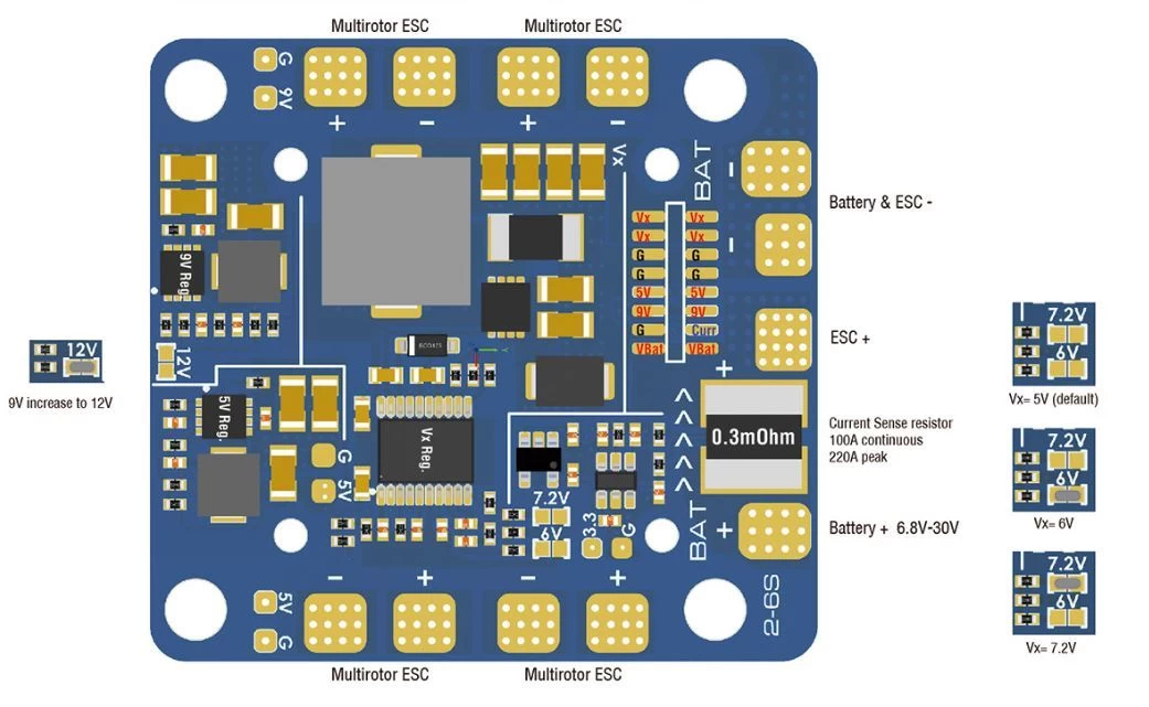 - Support continuous load of up to 30A & peak of 50A on each ESC pad of Quadcopter