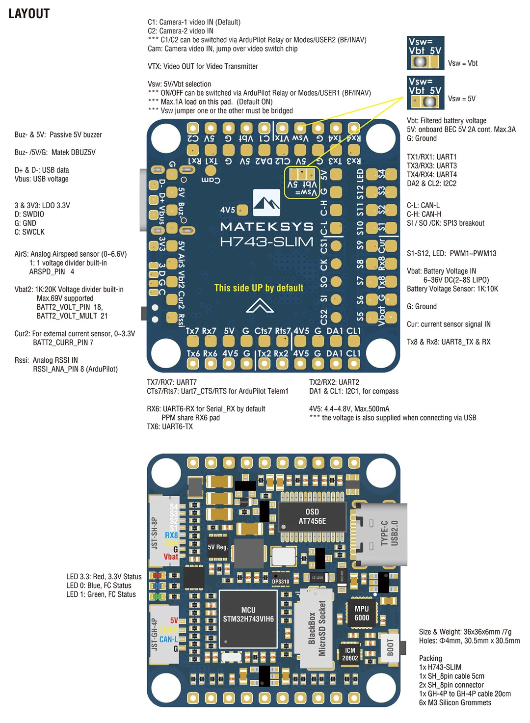 - 6x ADC (VBAT, Current, RSSI, Analog AirSpeed, Vbat2, Cur2)
