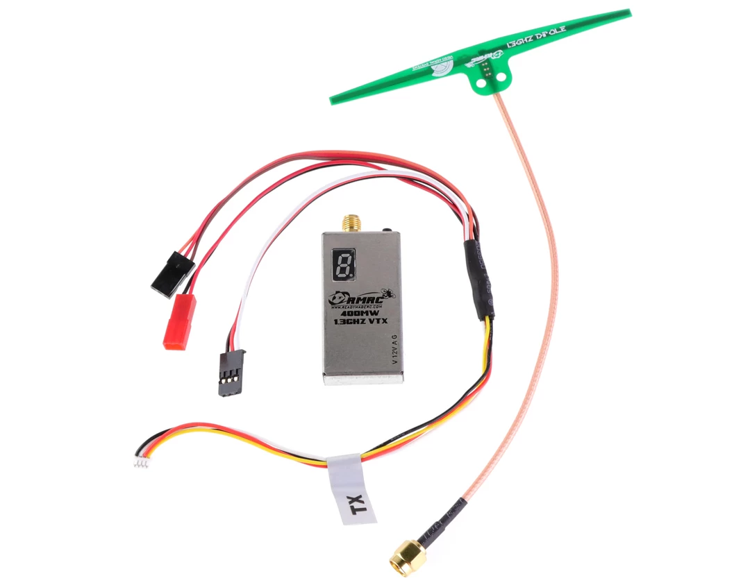 The RMRC 400mw 1.3GHz Video Transmitter is known as an ultra reliable work horse in the FPV community. Now we have made it even better by including a flexible PCB dipole antenna which has been perfected by Video Aerial Systems, included a cable with silicone wires that is actually useful for your setup, and decreased the price for you! On top of all that, these new transmitters actually output ~400mw instead of the typical power of around 300-350mw found on most others. This is not the same as the cheap copies available on eBay and from other overseas sources. Be sure to keep air flowing over transmitter to avoid overheating. Buy the best 1.3GHz available on the market today!