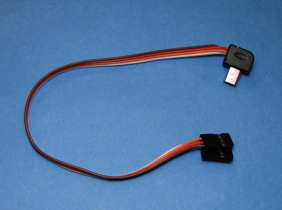 An audio/video cable for the GoPro HERO3, HERO3+, and HERO4 cameras using the USB Audio/Video live out port. On one side, a right angled USB connector linked to a super flexible servo cable, and on the other end two servo connectors: one for video and ground, and a second servo connector for audio (mono). A total length of 8 inches (20cm), weighing only 4g