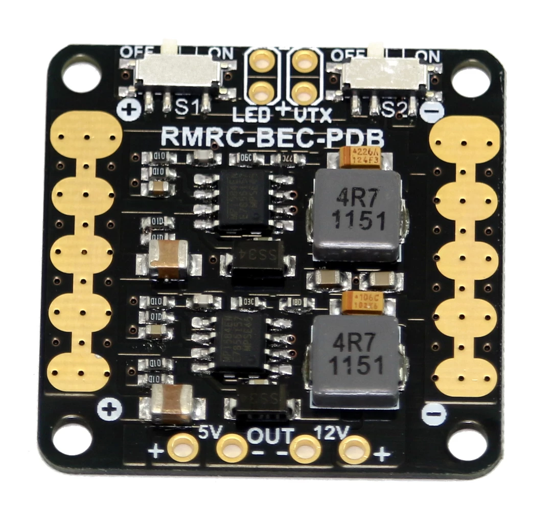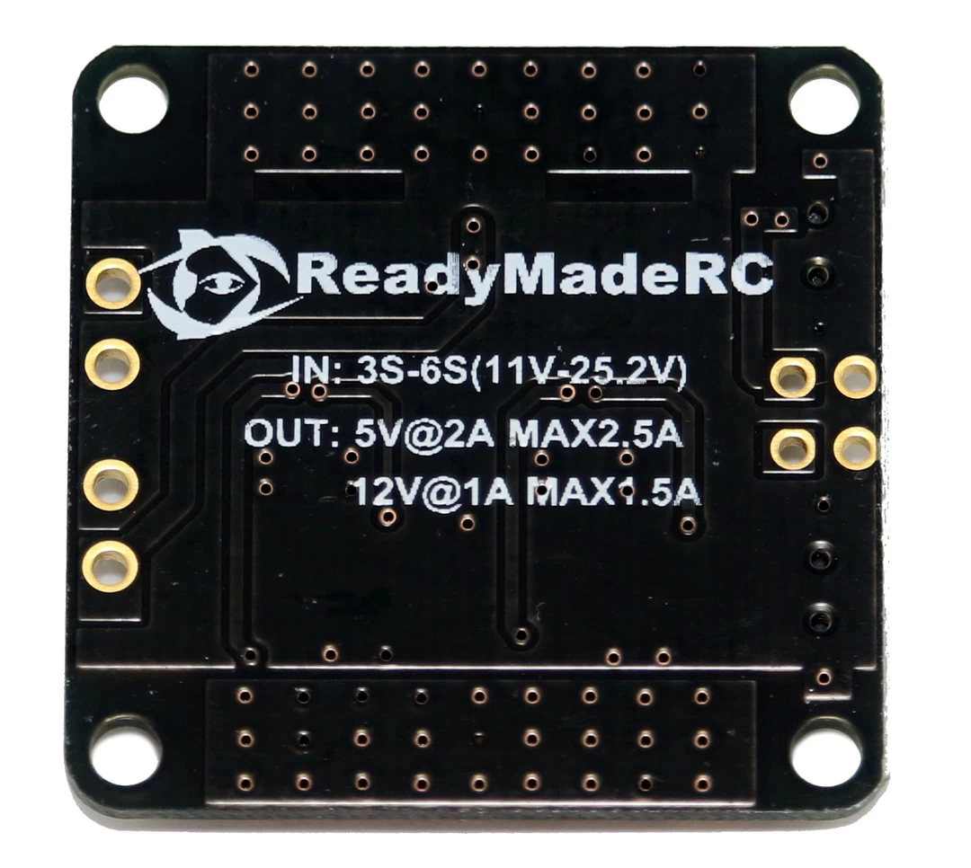 - OUT: 5V @ 2A (2.5A Max) 12V @ 1A (1.5A Max) (12V regulator will be below 12V when using 3s lipo)