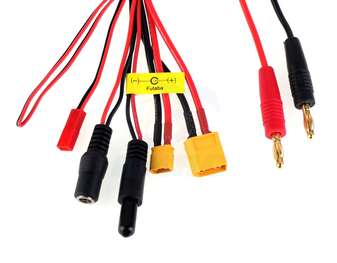 Tired of changing and losing charge wires? This squid has it all without being obnoxious. A charge harness with banana plugs on one end and multiple connectors on the other, including: