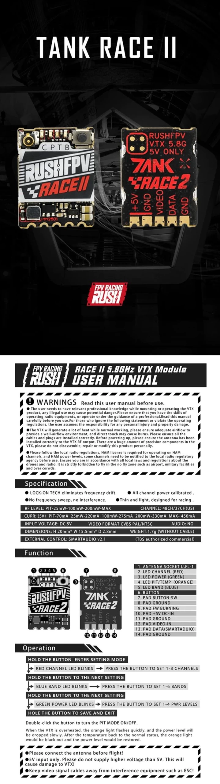 - 1x RushFPV Rush Tank Race II 5.8GHz VTX w/ SmartAudio